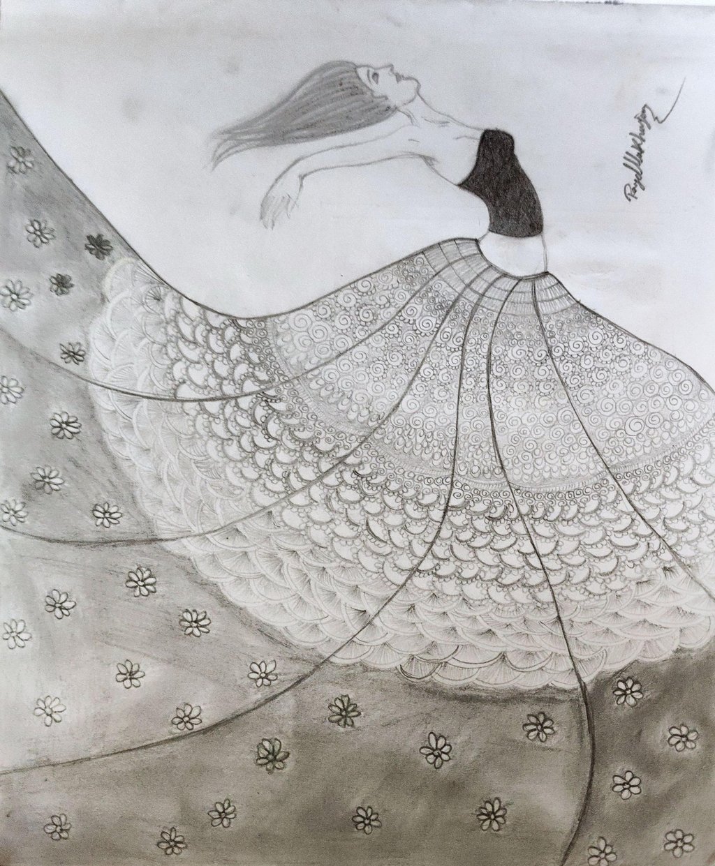 This pencil sketch is more than just an illustration—it is a quiet narrative of movement, emotion, and artistic dedication. The flowing dress, intricate detailing, and expressive pose transform a simple medium into something deeply evocative.