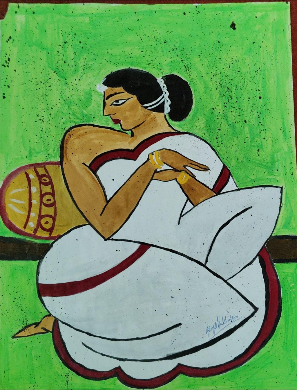 The woman’s attire and accessories reflect cultural identity. Her bangles, neatly tied hair, and traditional saree represent everyday elegance rooted in Indian heritage. The pot placed behind her adds a domestic and cultural context, hinting at simplicity and grounded living.