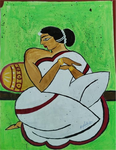 Art rooted in tradition often carries a quiet strength, and this painting beautifully reflects that essence. With its bold colors, simplified forms, and cultural symbolism, the artwork offers a serene yet powerful portrayal of an Indian woman in a moment of calm introspection.