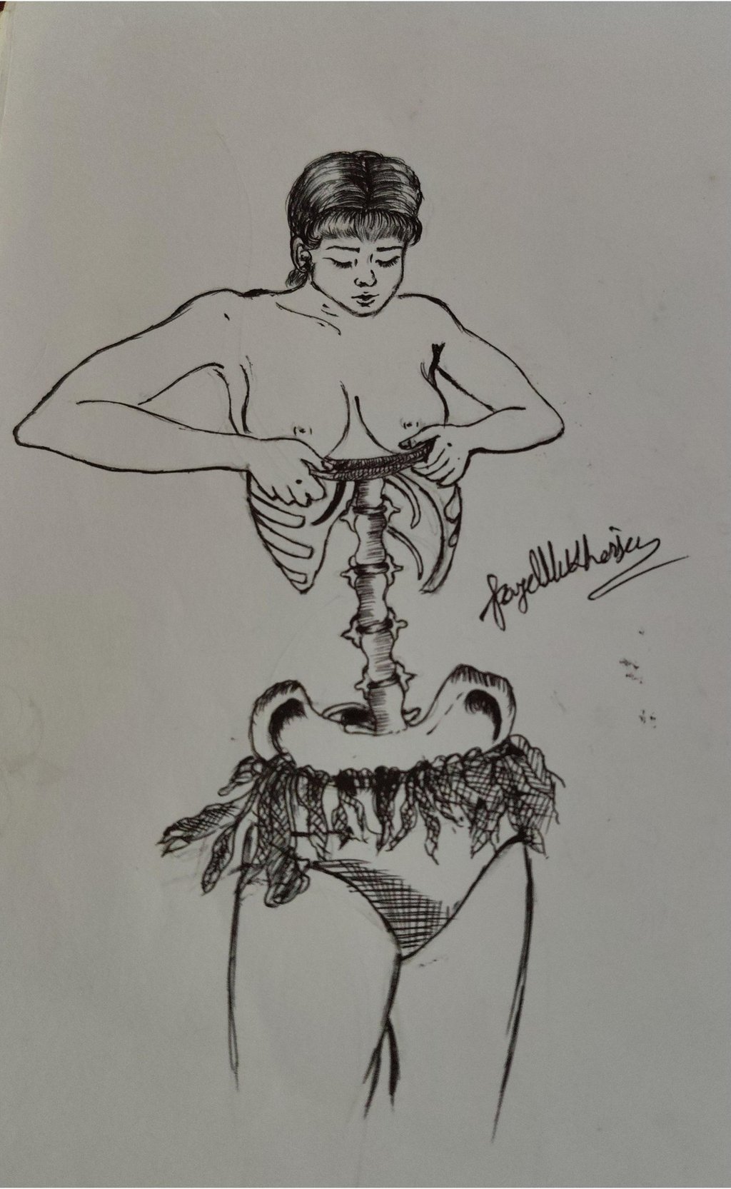 At first glance, the artwork presents a delicate human figure, carefully drawn with fine lines and subtle detailing. But as the eyes move deeper, the surface begins to dissolve. The body is no longer whole—it opens, revealing the skeletal structure beneath. The ribcage, spine, and inner framework emerge, creating a striking contrast between external beauty and internal reality.