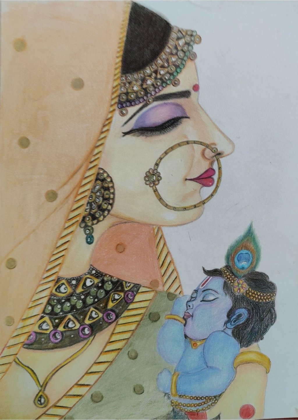The artist has paid careful attention to intricate details. Yashoda’s jewelry, including her nose ring, earrings, and necklace, is beautifully illustrated, reflecting traditional Indian aesthetics. Her saree, with soft patterns and warm tones, enhances the cultural richness of the composition.