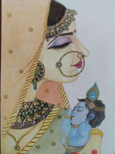 Explore a heartwarming painting of Yashoda and baby Krishna, capturing maternal love, devotion, and cultural beauty through soft colors and intricate detailing.